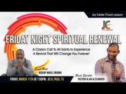 Friday Night Spiritual Renewal, Pastor Alan Alexander , Joy Center El Paso, TX March 11, 2022 View SHARE ON Twitter Facebook Buffer LinkedIn Pin It Leave a Reply Cancel replyYour email address will not be published. Required fields are marked *Comment * Name * Email * Website Δ Continue Reading Tapping Into The Power To Never Feel Powerless Again, Bishop Mikel Brown, Joy Center El Paso, TX Saturday Spiritual Encounter, Pastor Alan Alexander, Joy Center El Paso, Tx